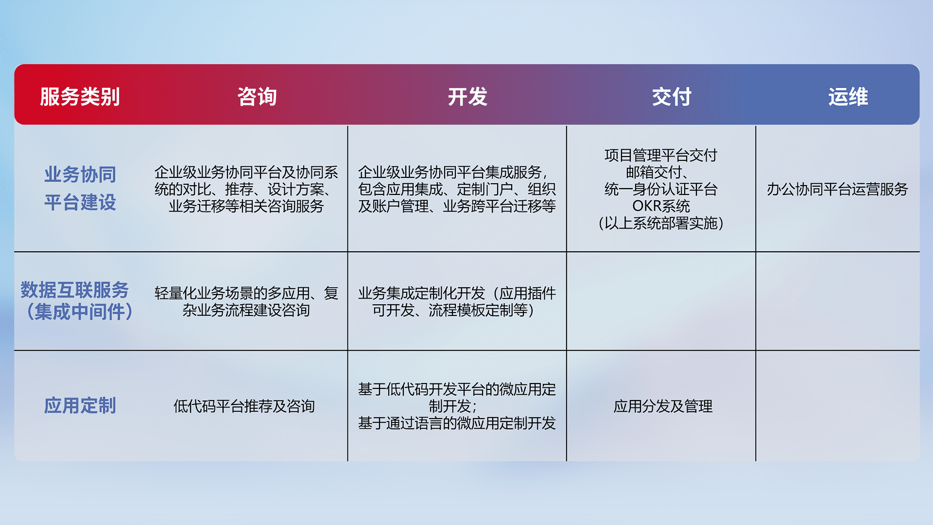 针对钉钉、、、企微、、IDaas等平台级产品提供产品的规划、、、、方案、、、交付、、、定制化开发等服务,,实现如统一协同办公、、、、智能客户服务、、、、混合会议管理、、智能数据查询、、、等业务场景,,,,实现数字化转型。。。。