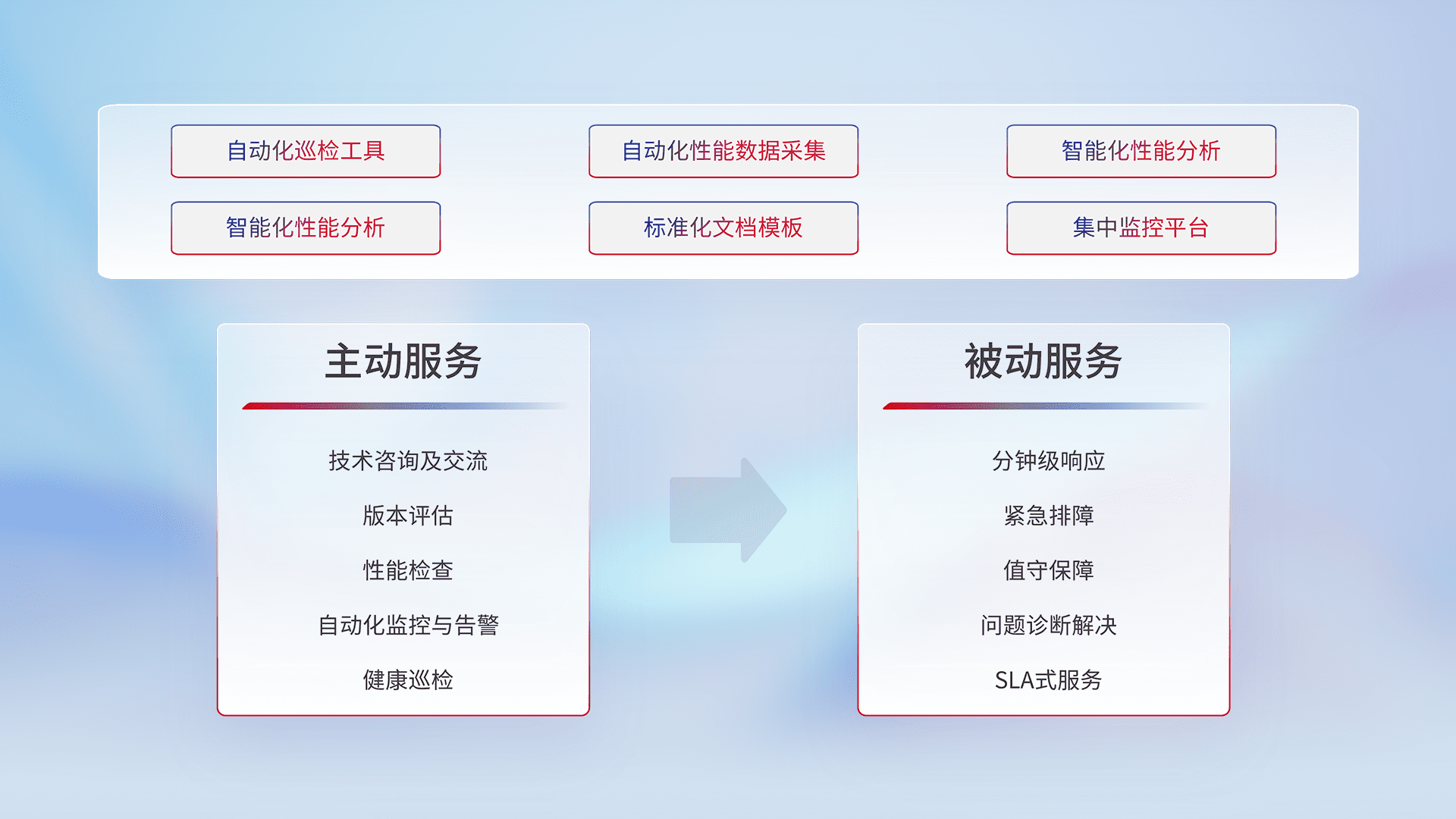 智能化工具和标准化文档,,保障服务质量,,提供主动服务(包含技术咨询、、、版本评估、、、性能检查、、自动化监控与告警、、、健康巡检)和被动服务包含(分钟级响应、、、紧急排障、、值守保障、、问题诊断解决、、、、SLA服务)。。。。